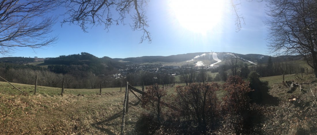 Heil erreichte ich die schneefreien Gefilde, schaute mir noch die berühmte Sprungschanze an und genoss dann den sonnendurchfluteten Wald, in dem mir nur wenige andere Wanderer begegneten. Als ich Willingen schon wieder direkt vor mir hatte, kam ich noch an einem Wildgehege vorbei, wo ich den Elch und die Rehe bewunderte, die sich etwas enttäuscht abwandten, als ich sie nicht füttern konnte.