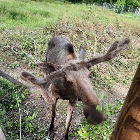 Das Kontrastprogramm war der Nachmittag, wo wir nach einstündiger Fahrt in einen Elchpark gingen. Auch das kann man nur bedingt planen. Die Elchpark-Besitzer, ein deutsches Ehepaar, hatten die Tiere zwar extra für uns wenig gefüttert, aber als wir kamen, lagen sie dennoch alle müde im Schatten und waren trotz unserer Bemühungen (seht ihr, wie wir auf den Fotos mit den Birkenzweigen wedeln?) nicht zum Aufstehen zu bewegen.