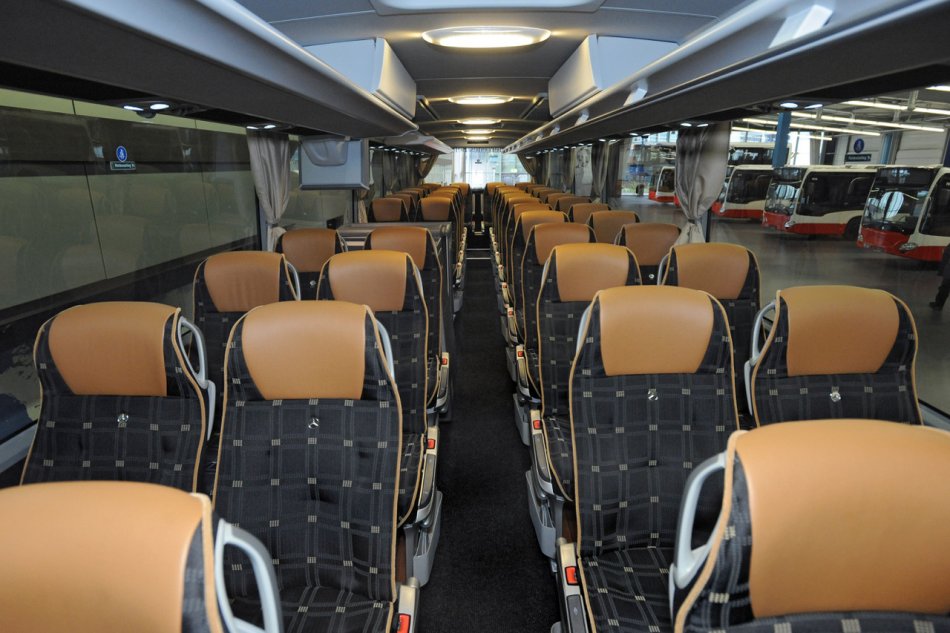 Fernreisebus mit WC, Klimaanlage, Bordküche, Video, Schlafsessel mit Fußstützen und klappbaren Fahrgasttischen, 2 Kühlschränke, USB-Steckdosen, modernste Sicherheitsaustattung mit Bremsassistent, Euronorm VI- Standard