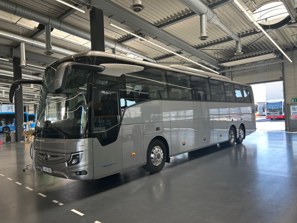 Fernreisebus mit WC, Video (DVD), Kühlschrank, Sicherheitsgurte, Fußstützen, Klapptische, USB-Steckdosen, modernste Sicherheitsausstatung mit ESP und Bremsassistent (BA), Abbiegeassistent, Euro VI-E -Norm
